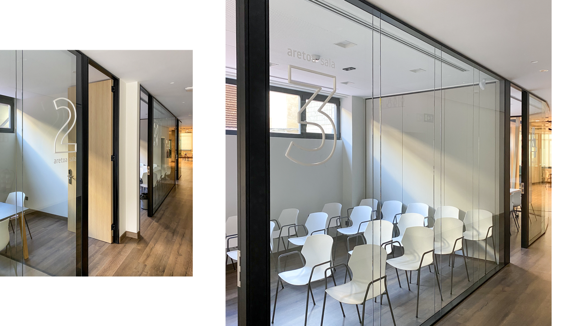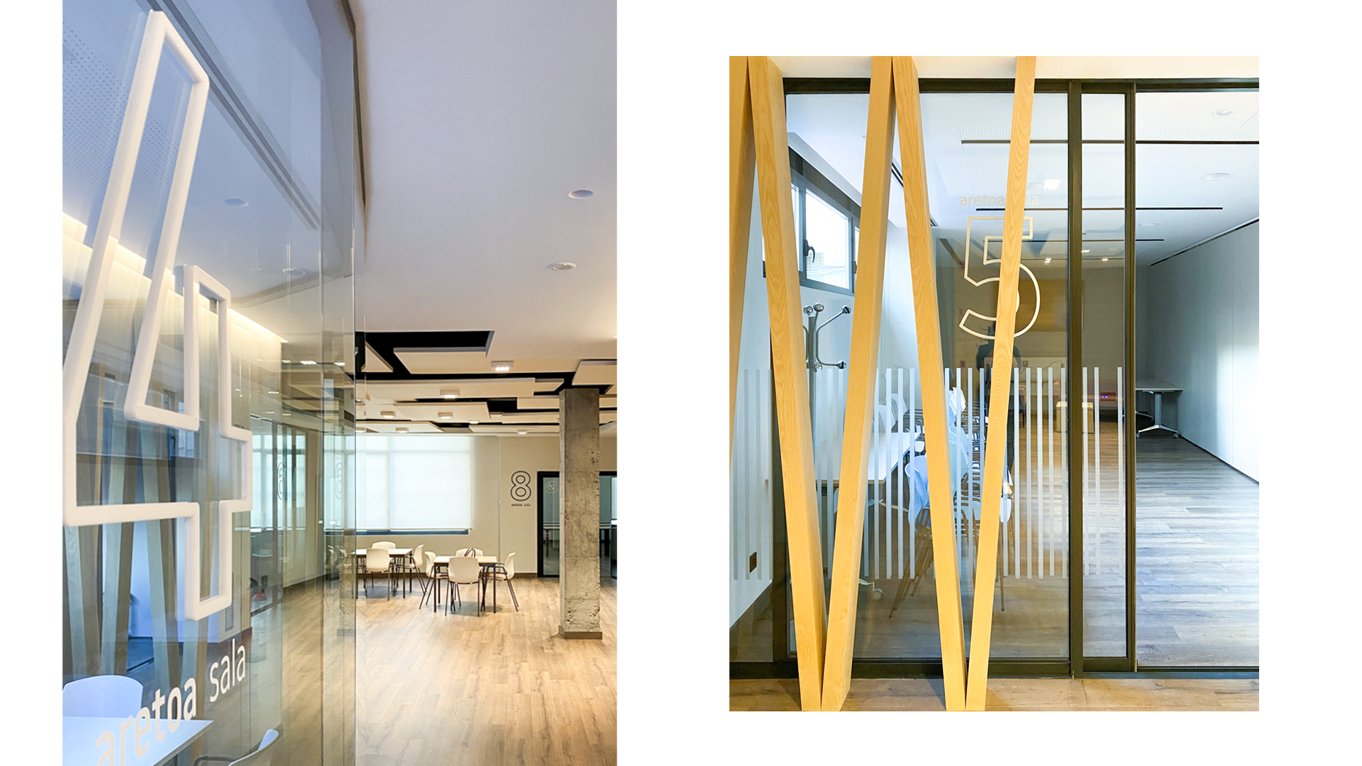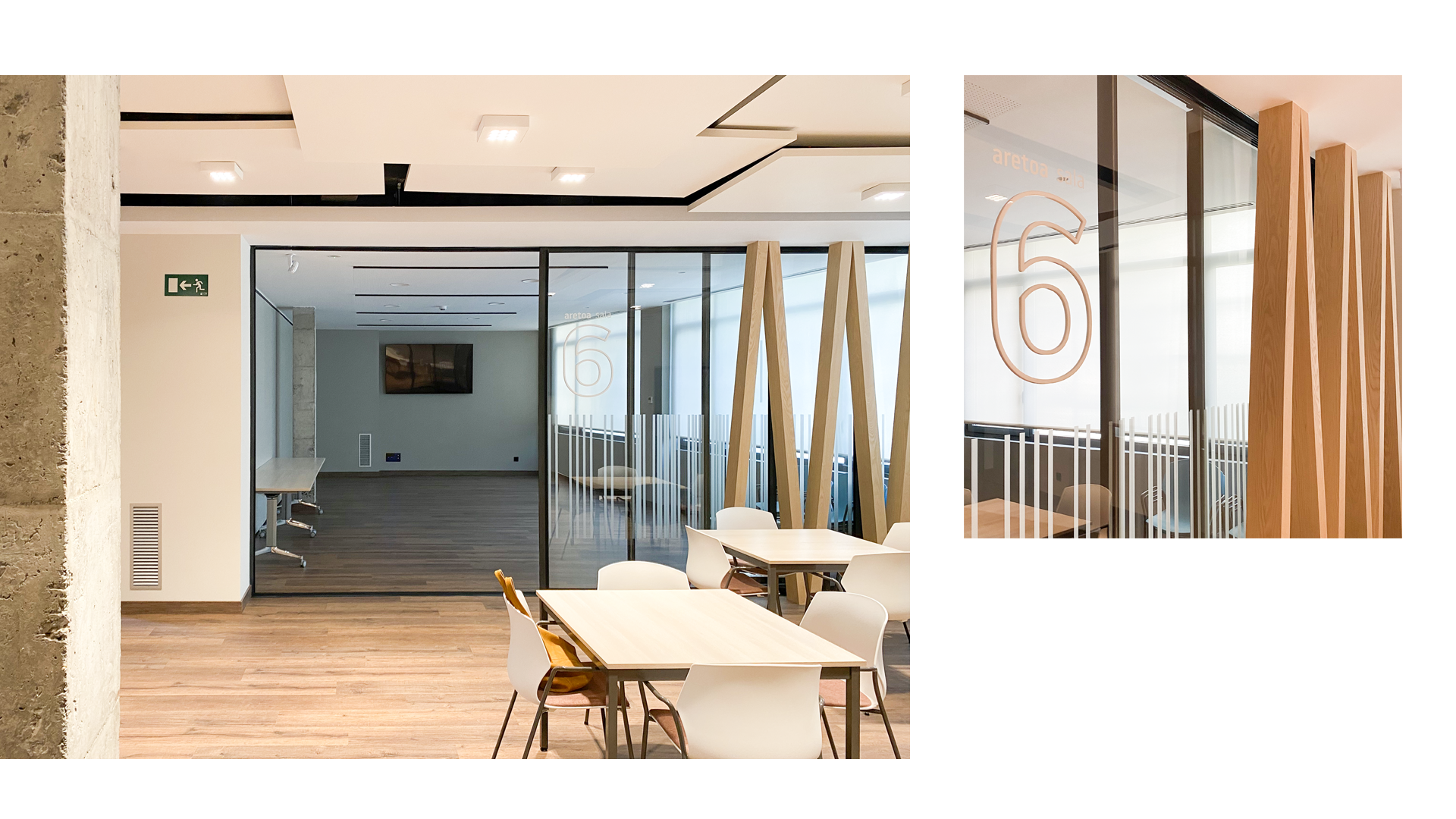 Muy visuales y prácticos para facilitar la localización de cada espacio de un solo vistazo. Realizados mezclando vinilo de corte y metacrilato negro con volumen. El resultado es una pieza que llena la pared y la decora a la vez que cubre una necesidad. Hay dos directorios: uno para el piso O y otro para el piso -1. Numeración Salas