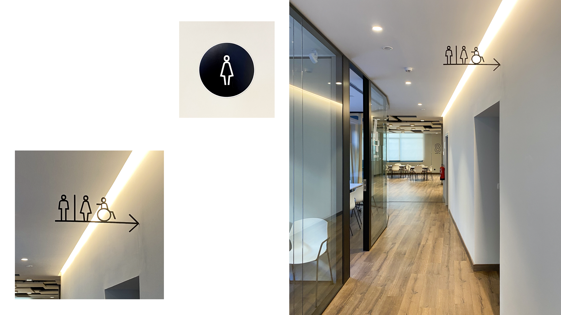El resto de la señalización: iconos, textos explicativos, etc, está realizado en vinilo de corte y acompaña discretamente a las grandes piezas en volumen.Servicios